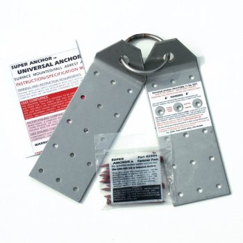 No other anchor has as many fastening options as the Universal. The Universal is a heavy-duty, 11 gauge stainless steel surface mounted anchor point. You have your choice of installing the anchor at the peak of the rood (up to a 12/12 pitch) or in the field using our hex head screws or duplex nails. Several different mounting options are made available to the user including: through sheathing into top chord, throuhgh sheathing only, or through existing roofing.sheathin. It is 100% component compatible withall our Fall Arrestor and Total Package systems using either a carabiner or snap-hook attachment. Included with each anchor is a detailed instruction manual . The Universal Anchor is rated for fall arrest/fall restraint.